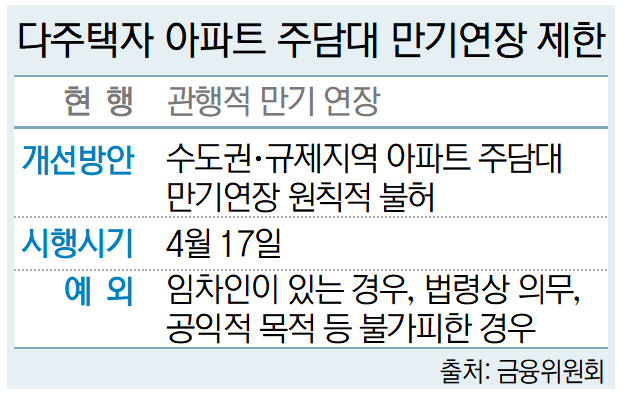 정부가 오는 17일부터 다주택자가 보유한 수도권·규제지역 아파트 담보대출의 만기 연장을 원칙적으로 불허하기로 했다. 가계부채 증가율 목표도 더 낮추고 탈법·편법 대출 단속도 강화하기로 했다.
