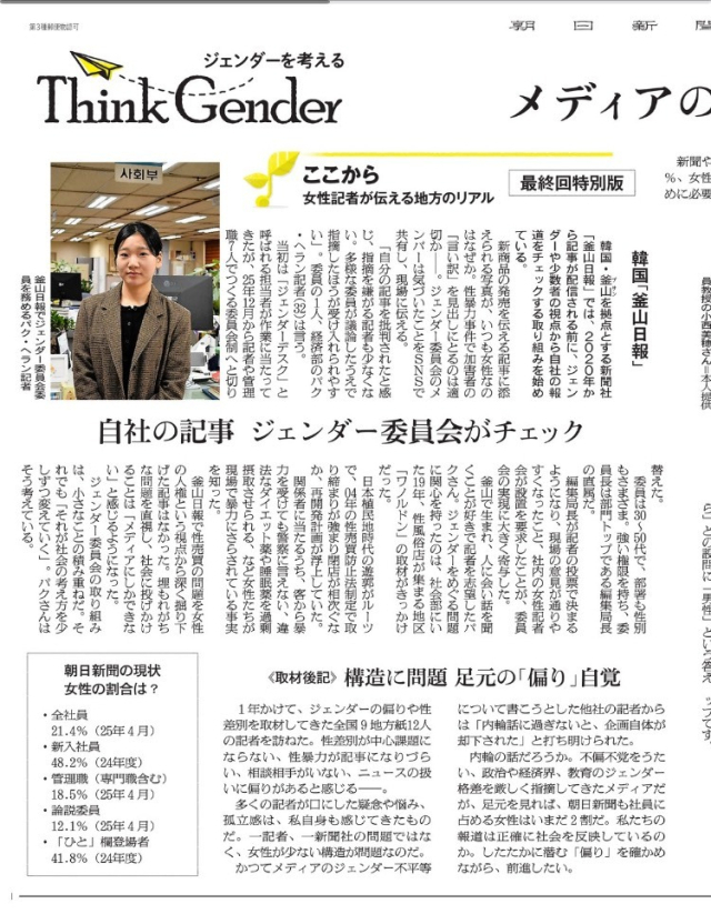 일본 아사히신문은 지난 25일 ‘미디어의 남녀 격차, 해외에서는’이라는 제목의 기사(사진)를 통해 성평등 보도 시스템을 적용 중인 해외 언론 사례로 〈부산일보〉의 ‘젠더위원회’와 영국 BBC의 ‘50 대 50 프로젝트’를 소개했다.
