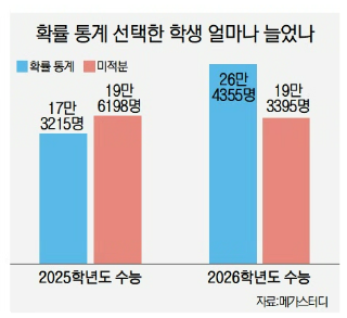 2026학년도 수능에서 이미 확통 응시자 수(26만 4355명)가 미적분 응시자 수(19만 3395명)를 추월한 데 이어, 올해는 그 격차가 더욱 벌어질 것이라는 관측이 지배적이다.