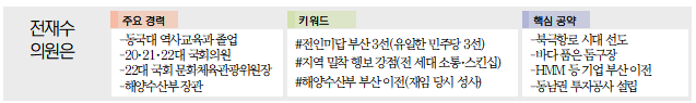국회 입성 후 전 후보자는 부산에서만 내리 3선에 성공했다. 그의 지역구인 부산 북갑은 보수세가 강한 곳이지만 전 의원의 개인기로 자리를 지켜왔다는 게 중론이다. 전 의원은 특히 지난 22대 총선 당시 현역 의원 2명을 비롯해 18개 지역구 중 17개 지역에서 민주당 후보가 모두 낙선한 어려운 상황에서도 지역구를 지켜 부산에서 ‘새 역사를 썼다’는 평가를 받았다. 3선 고지를 달성하면서 전 의원의 정치적 체급도 훨씬 커졌다.
