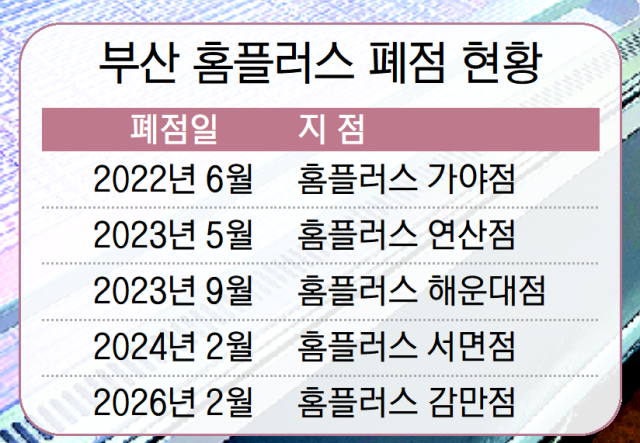 부산에선 2022년부터 현재까지 5곳의 홈플러스 매장이 문을 닫았다. 가장 최근에는 감만점이 지난 2월 폐점을 완료했다. 현재 부산에선 센텀시티점 등 7곳이 영업 중이다.