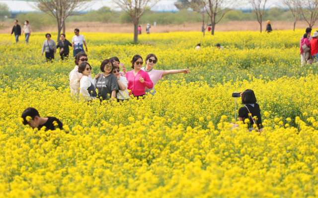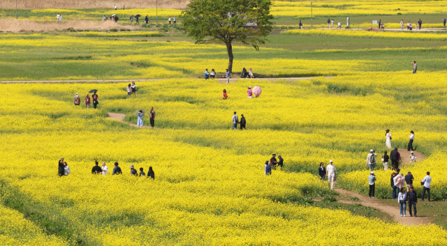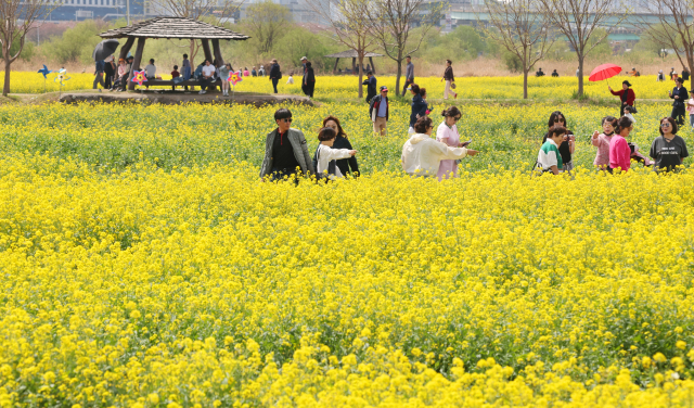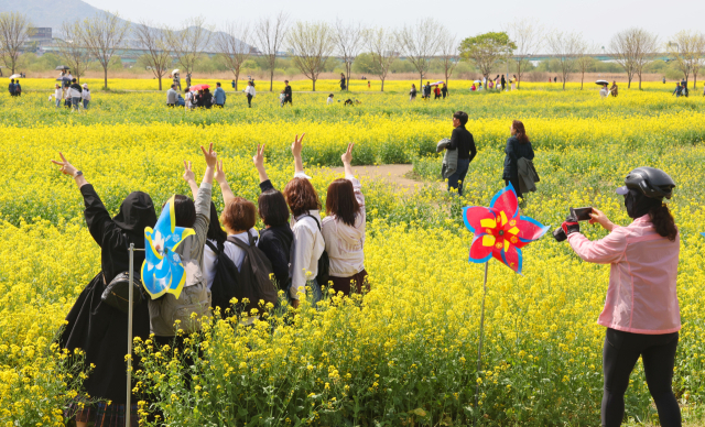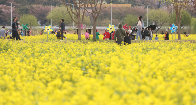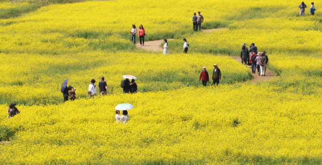 화창한 봄날씨를 보인 12일 부산 강서구 대저생태공원 유채꽃경관단지에서 휴일 나들이객들이 샛노란 유채꽃 사이를 거닐며 봄 정취를 만끽하고 있다.