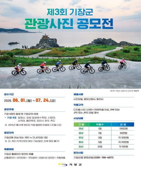 한편 기장군은 앞선 두 차례의 공모전을 통해 양질의 작품을 확보하며 지역 홍보의 기틀을 마련한 바 있다. 이번 제3회 공모전 역시 단순한 연례 행사를 넘어, 기장의 수려한 가치를 독창적인 콘텐츠로 승화시키는 발굴의 장이 될 것으로 기대된다.