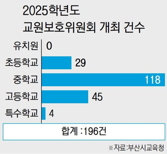 16일 부산시교육청에 따르면, 지난해 교권 침해 사안으로 교원보호위원회가 개최된 건수는 총 196건으로 집계됐다. 교원보호위원회는 학생이나 학부모가 교사의 정당한 교육활동을 침해했을 때 이를 심의하여 가해자 조치와 피해 교원 보호를 결정하는 기구다. 교육계 안팎에서는 위원회에 회부되지 않은 경미한 사례까지 포함하면 실제 교권 침해 빈도는 이를 훨씬 상회할 것으로 보고 있다.