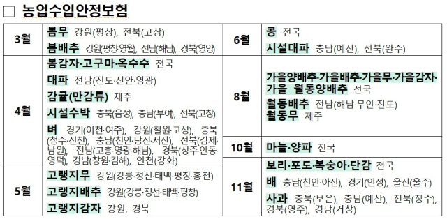 아울러 봄배추·봄무는 평창 등 주산지 중심으로 시범 운영에 착수하는 한편, 봄감자·고구마·옥수수는 전국으로 확대해 운영한다.