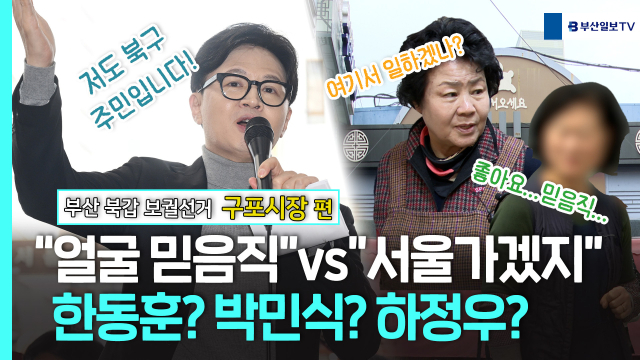 <부산일보TV>는 북갑 국회의원 재보궐선거를 40여 일 앞둔 지난 17일 지역민들의 생생한 목소리를 들으러 북구 구포시장을 찾았다. 이곳에서 한 전 대표를 비롯해 하 수석, 과거 북·강서구갑에서 재선을 한 박민식 전 국가보훈부 장관의 ‘3파전’이 점쳐지고 있다. 특히 최근 출마를 공식화한 한 전 대표가 본격적으로 주민 밀착 행보에 시동을 걸면서 시민들도 지역구를 대표할 인물이 누가 될 것인지 촉각을 곤두세우고 있었다.