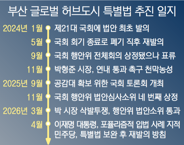 그러나 민주당의 이런 방침에 대해 지역 사회에서는 “기만적”이라는 비판이 나온다. 원내 압도적 다수당인 민주당은 지난 2년 동안 부산 글로벌법을 철저하게 무시해왔지만, 법안을 공동발의한 당 소속 전재수 의원이 부산시장 유력 후보로 나서자 태도를 확 바꿨다. 지난달 24일 전 의원이 법안 논의를 위해 당 지도부를 만나는 자리에서 한병도 원내대표는 “특별법은 부산의 생존이 걸린 문제”라며 법안 취지에 깊이 공감한다는 취지로 발언했고, 정청래 대표조차 “일이 되게끔 하라”며 법안 처리를 독려한 바 있다. 집권여당 후보로서 ‘전재수 효과’를 각인하려는 의도가 담긴 행보였다.