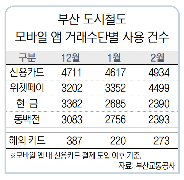 부산교통공사는 11월께 도시철도 역사 내 승차권 자동발매기에서 신용카드를 사용할 수 있도록 조치할 계획이다. 또 부산시는 2028년 하반기께 시내버스에서도 신용카드를 인식할 수 있는 요금 단말기 도입을 추진하고 있다.