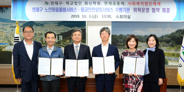 연제구(구청장 이성문)는 1일 구청 소회의실에서 노인맞춤돌봄서비스·응급안전 알림서비스 운영 수탁기관으로 선정된 3개기관(학교법인 화신학원, 연제공동체, 사회복지법인 제세)와 위탁운영 협약을 체결했다.