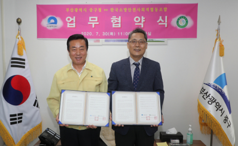 부산 중구(구청장 최진봉)는 30일 행정안전부 지정 교육기관이며, 소방청인가 제1호 지정업체인 ‘한국소방안전 사회적협동조합(이사장 진영배)’과 업무 협약을 체결했다.