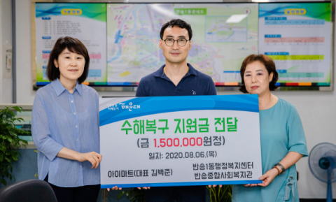 해운대구 반송1동 소재 아이마트(대표 김백준)는 지난번 내린 폭우로 피해를 본 반송1동 주민들과 반송종합사회복지관을 위해 수해복구 지원금을 지난 6일 반송1동 행정복지센터(동장 강혜경)에 전달했다.