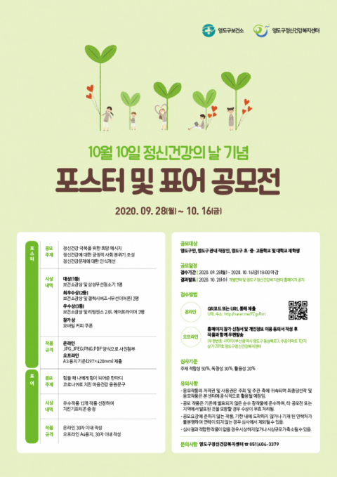 부산시 영도구(구청장 김철훈)에서는 9월 28일부터 10월 16일까지 ‘세계 정신건강의 날(10월 10일)’을 맞이하여 포스터 및 표어 공모전이 개최된다.