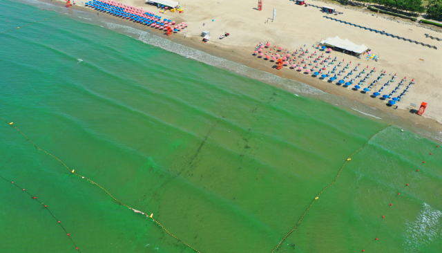사하구청은 지난 12일 다대포해수욕장 해변에서 녹조가 발견되자 부산보건환경연구원에 수질검사를 의뢰했다. 조사 결과 다대포해수욕장과 해양레저 구역, 해수천 등 3곳에서 녹조를 일으키는 마이크로시스티스 남조류가 다량 검출됐다. 특히 해수천 구역에서는 mL당 최대 8만여 개의 남조류가 나왔다. 이는 조류경보 ‘관심’ 단계에 해당한다.
