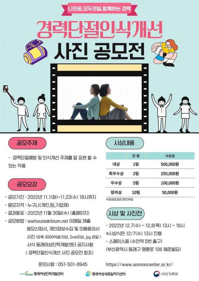 동래여성인력개발센터(관장 이숙련)는 여성가족부 경력단절예방지원사업으로 경력단절예방인식개선 사진공모전을 개최한다고 밝혔다.
