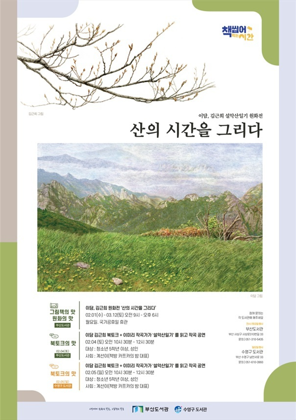 한편, 부산시 주민참여예산으로 제안된 ‘시민에게 원화의 맛을, 그림책의 맛을’ 사업 중 하나로 ▲부산도서관의 이담․김근희 <설악산 일기> 외에 ▲금샘도서관의 <부산작가 2인전:신유미, 차야다>전, ▲우리그림책작가를 키우는 ‘우리출판사 북큐레이션’이 부산도서관, 남구도서관, 사하도서관, 정관도서관에서 진행된다.