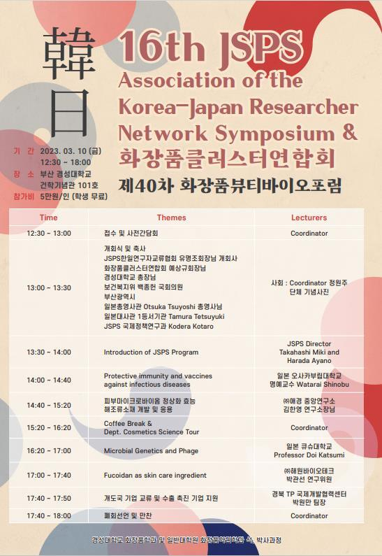 한편 이번 행사는 재단법인 일본학술진흥회(JSPS), 한-일 연구자교류협회, 비영리사단법인 화장품클러스터연합회, ㈜진코스텍, ㈜케미랜드, ㈜바이노텍, (주)CMK, (주)에코마인, ㈜튜링겐코리아, ㈜제노랩, (사)부산화장품산업협회, 명성부부치과의원, 장림치과의원, (재)포항테크노파크 첨단바이오융합센터, 경성대학교 LINC+ 3.0 사업단, 경성대학교 PharmaCos ICC사업단, 경성대학교 화장품학과·일반대학원 석,박사 화장품약리학과가 공동주최로 참여한다.