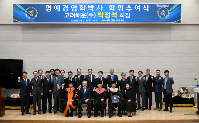 한국해양대학교(총장 도덕희)는 27일 해사대학 신관 세미나실에서 ‘명예박사 학위수여식’을 열고 고려해운 박정석 회장에게 명예 경영학 박사 학위를 수여했다.
