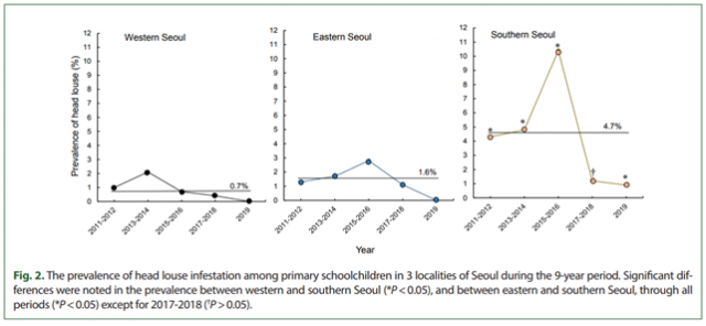 본 연구에서 가장 흥미로운 점은 머릿니 평균 감염률이 서울 남부에서 가장 높은(4.7%)반면, 서울 서부(0.7%) 및 서울 동부(1.6%) 지역에서는 비교적 낮다는 점이다.