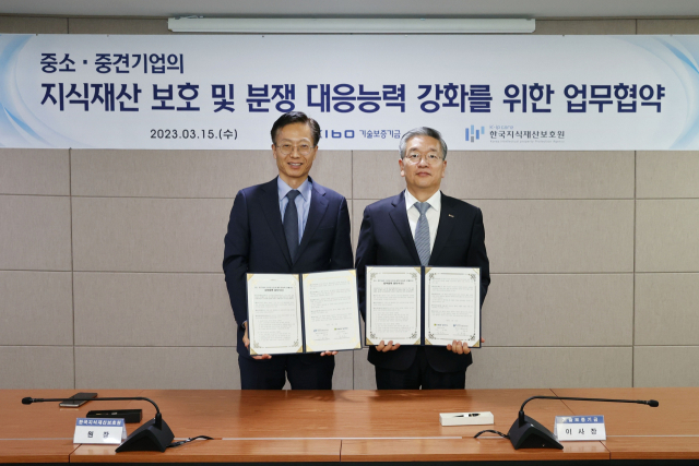 기술보증기금(이사장 김종호, 이하 ‘기보’)과 한국지식재산보호원(원장 김용선, 이하 ‘보호원’)은 15일 기보 본점에서 ‘중소·중견기업의 지식재산 보호 및 분쟁 대응능력 강화를 위한 업무협약’을 체결했다고 밝혔다.