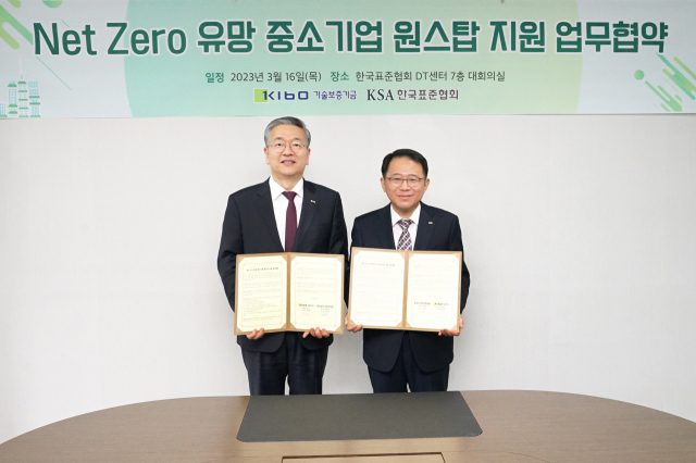 기술보증기금(이사장 김종호, 이하 ‘기보’)은 한국표준협회(회장 강명수, 이하 ‘협회’)와 16일 서울 강남구 소재 협회 대회의실에서 'Net Zero 유망 중소기업 원스탑 지원 업무협약'을 체결했다고 밝혔다.