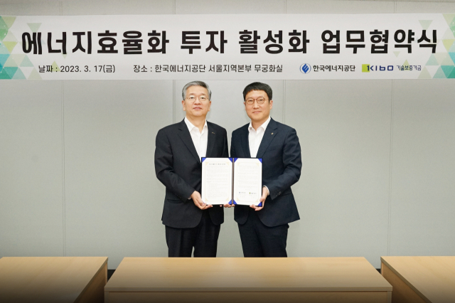 기술보증기금(이사장 김종호, 이하 ‘기보’)은 한국에너지공단(이사장 이상훈, 이하 ‘공단’)과 17일 서울 영등포구 소재 공단 서울지역본부에서 '에너지효율화 투자 활성화 업무협약'을 체결했다고 밝혔다.