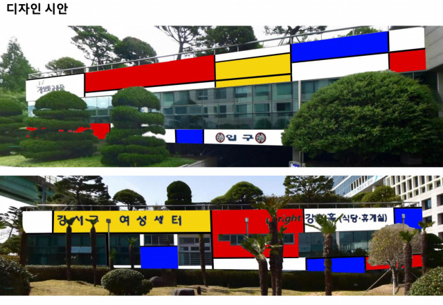 강서구는 도색한지 10년이 지나 칙칙한 구청사 외벽을 화가 몬드리안 색채인 빨강, 노랑, 파랑의 삼원색과 친환경 나노세라믹 페인트로 채색해 미관 문제와 시설유지관리를 개선하기로 했다.