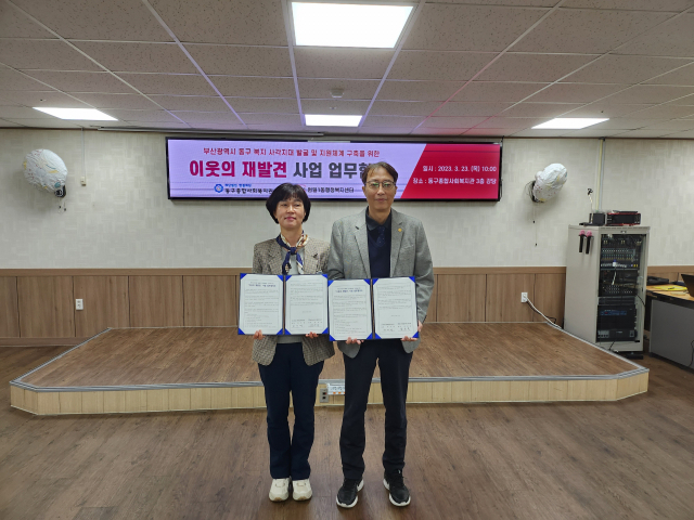 부산 동구(구청장 김진홍) 범일1동 행정복지센터는 23일 복지사각지대 발굴 및 지원체계 구축사업 ‘이웃의 재발견’ 추진을 위해 동구종합사회복지관(관장 김성용)과 업무협약(MOU)을 체결했다.