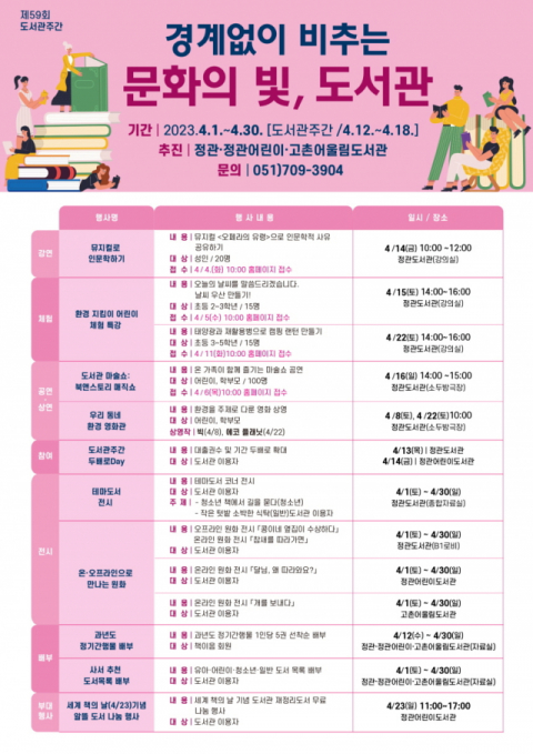 기장군(군수 정종복)은 ‘제59회 도서관주간’을 맞아 4월 1일부터 30일까지 한 달간 풍성한 독서문화 행사를 진행한다고 27일 밝혔다.
