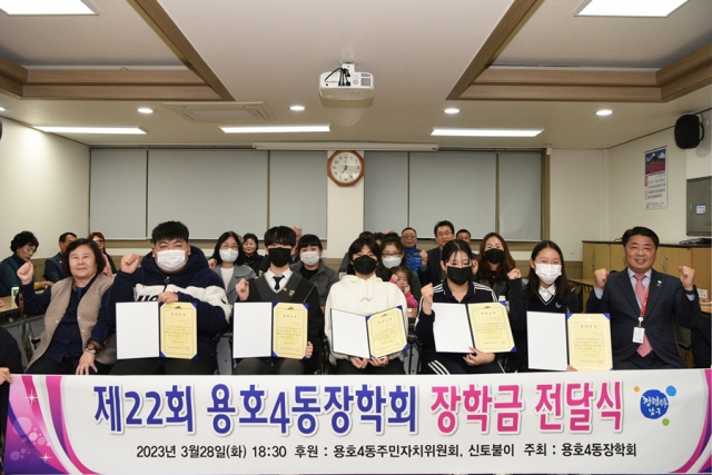 부산 남구 용호4동 장학회에서는 지난 28일 제22회 장학금 전달식을 개최했다. 올해는 관내 중․고 학생들 중 총 5명을 선발하여 1인당 50만 원씩 총 250만 원을 전달했다. 특히 용호골목시장 상인회 회장 윤성섭씨가 100만원을 장학금으로 기탁하여 더욱 뜻깊은 행사가 됐다.