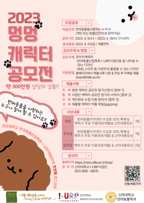 신라대학교(총장 허남식) 반려동물산업특화 I-URP 조성사업단(단장 배일권)이 ‘멍멍 캐릭터 공모전’을 개최한다고 10일 밝혔다.