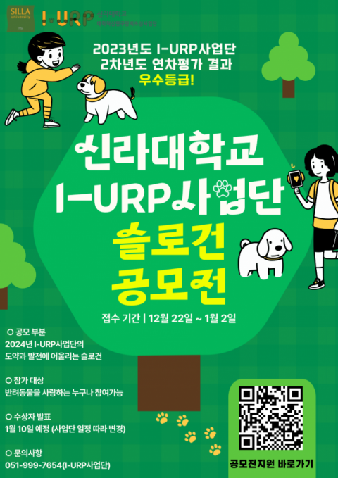 신라대학교 반려동물산업특화 대학혁신연구단지(I-URP) 조성사업단은 최근 2차년도 연차평가 우수등급을 받아 2024년 3차년도 사업의 도약과 발전을 도모하고자 슬로건 공모전을 개최한다.