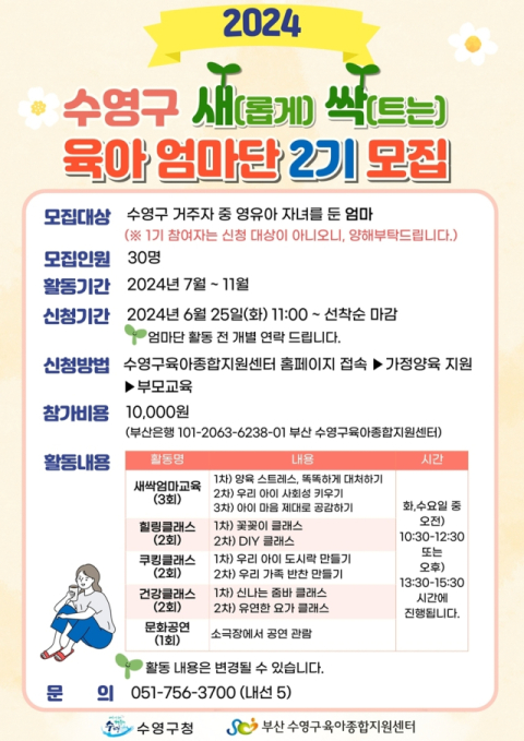 부산광역시 수영구(구청장 강성태)에서는 수영구 육아종합지원센터(센터장 심은주)에서 자녀 양육에 많은 어려움을 겪고 있는 초보 엄마들을 위해 「수영구 새.싹.육아엄마단」2기를 모집한다고 밝혔다.