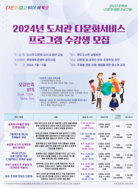 7월 24일부터 8월 30일까지 운영하는 오감만족BTS(Book, Think, Taste, See) 프로그램은 다문화 및 내국인 유아·초등학생·성인을 대상으로 진행한다.
