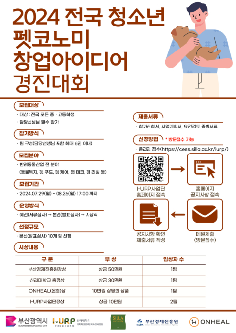 신라대학교(총장 허남식) I-URP사업단이 ‘2024년 전국 청소년 펫코노미 창업아이디어 경진대회’ 참가자를 모집한다고 26일 밝혔다.