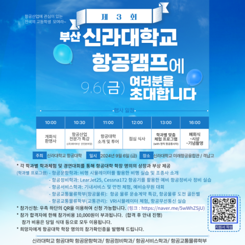 항공캠프에 참가를 희망하는 학생은 포스터의 QR코드를 통해 접수가 가능하며 자세한 사항은 신라대 홈페이지 또는 신라대 항공대학 각 학과 홈페이지를 통해 확인이 가능하다.