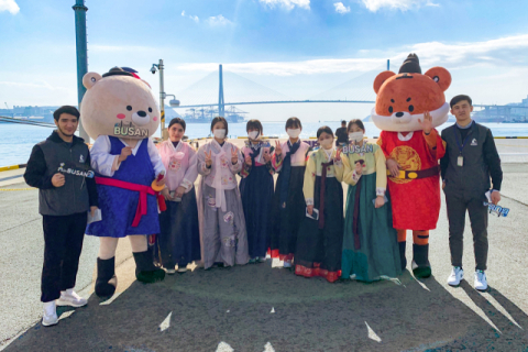 와이즈유 영산대학교 학생들이 부산항 국제여객터미널에서 크루즈 승객에게 봉사활동하고 기념촬영을 하고 있다.