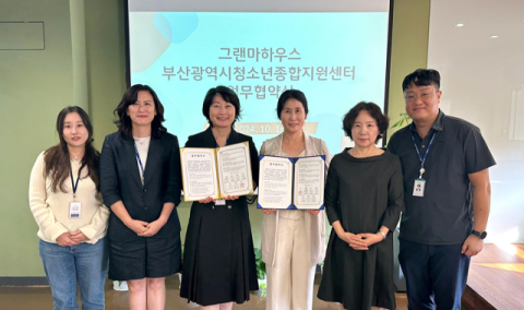 지난 16일 부산광역시청소년종합지원센터 내 카페아띠에서 청소년종합지원센터 소속기관 소장들과 그랜마하우스 전혜정 대표가 참석한 가운데 업무협약식을 진행했다.