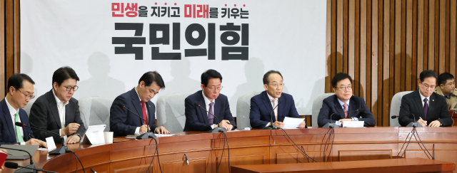 국민의힘 추경호 원내대표(오른쪽 세번째)가 8일 오전 국회에서 열린 원내대책회의에서 발언하고 있다. 연합뉴스