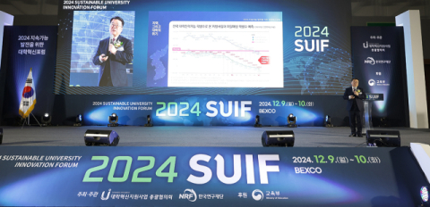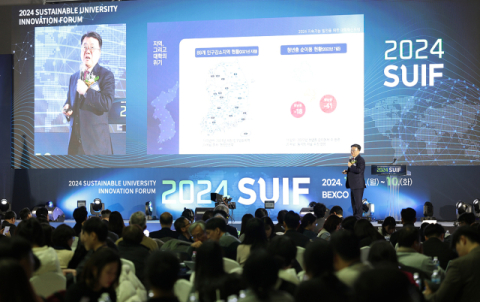 인제대학교 전민현 총장이 9일 오후 부산 벡스코에서 열린 ‘2024 지속가능발전을 위한 대학혁신포럼’에서 기조강연을 통해 대학과 지역 사회의 위기 극복을 위한 혁신적 비전을 제시했다.
