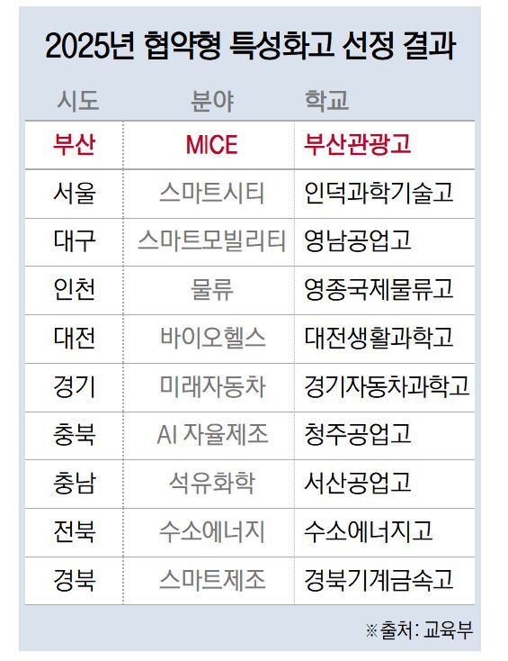올해 협약형 특성화고로 선정된 학교는 부산관광고를 포함해 서울 인덕과학기술고(스마트시티), 대구 영남공업고(스마트모빌리티), 인천 영종국제물류고(물류), 대전생활과학고(바이오헬스), 경기자동차과학고(미래자동차), 청주공업고(AI 자율제조), 서산공업고(석유화학), 수소에너지고(수소에너지), 경북기계금속고(스마트제조) 등이다.