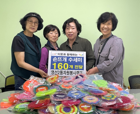 영선2동 자원봉사캠프(캠프장 고사순)는 지난 9일 영선2동행정복지센터(동장 박호영)를 방문하여 손뜨개 수세미 160개를 전달했다.