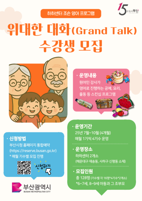 부산시(시장 박형준)는 신노년세대 사회참여 공간인 하하센터에서 17일부터 6월 30일까지 15분도시 부산의 조손 영어프로그램 '위대한 대화(Grand Talk)' 강좌 1기 수강생을 모집한다고 밝혔다.