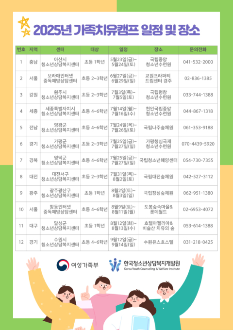 프로그램은 참가 대상 청소년의 연령에 따라 두 가지 형태로 진행된다. 중·고등학생은 7박 8일간 운영되는 ‘인터넷·스마트폰 치유캠프’, 초등학생은 보호자와 함께 ‘가족치유캠프’에 참여할 수 있다. 초등 1학년은 1박 2일, 초등 2~6학년은 2박 3일의 일정이다.