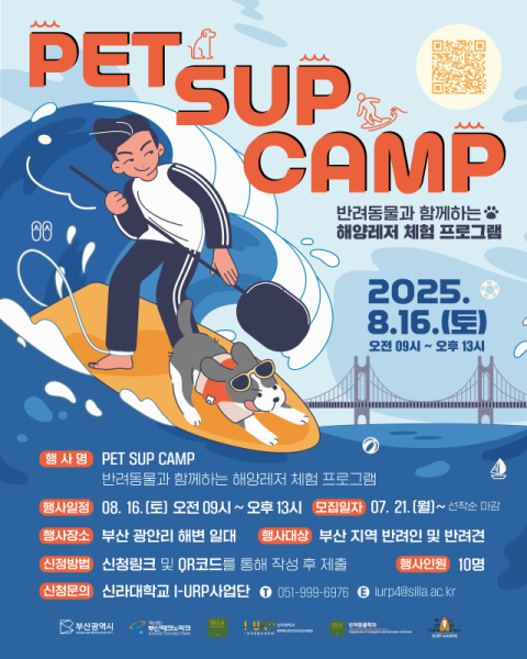 ‘2025 PET SUP CAMP’는 반려동물을 사랑하는 부산 지역 반려인 누구나 참여할 수 있으며, 자세한 내용은 신라대학교 I-URP사업단 공식 SNS 및 홈페이지에서 확인할 수 있다.