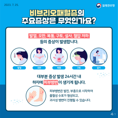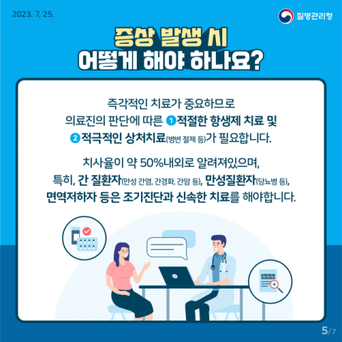 조규율 시 시민건강국장은 “비브리오패혈증은 예방 수칙을 지키는 것으로 충분히 예방할 수 있다”며 “간 질환자, 당뇨병 등 기저질환이 있는 비브리오패혈증 고위험군은 어패류 등 해산물 섭취 시 특히 주의해 주시길 바라며, 섭취 후 발열, 오한, 복통 등 증상이 나타나면 바로 의료기관을 방문해 치료받기를 당부드린다”고 전했다.