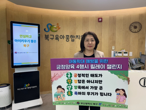 부산 북구(구청장 오태원)는 10일 아동학대 예방을 위한 ‘긍정양육 4행시’ 릴레이 챌린지에 부산북구육아종합지원센터 손장희 센터장이 동참했다고 밝혔다.