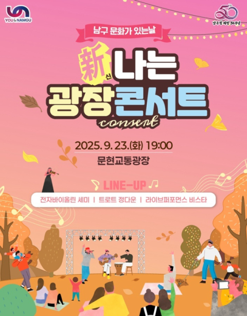 부산 남구(구청장 오은택)는 오는 23일 남구 문현교통광장에서 2025 남구 문화가 있는 날 ‘新나는 광장콘서트’를 개최한다.
