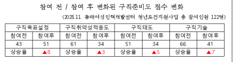 동래여성인력개발센터(관장 이숙련)는 2025년 고용노동부와 동래구의 컨소시엄사업으로, 청년도전지원사업을 올해 3월 장기1기 입학을 시작으로 중·단기 까지 참여자 128명 중 122명 이수로 총 95.3% 이수률을 달성했다고 밝혔다.