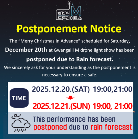 수영구는 “기상 여건으로 인해 공연 일정이 변경된 점에 대해 시민과 관람객 여러분의 양해를 부탁드린다”며 “크리스마스 시즌을 맞아 준비한 특별공연인 만큼 안전을 최우선으로 고려해 오는 21일로 일정을 변경해 준비하고 있으니 많은 분들이 함께해 따뜻한 크리스마스 분위기를 느끼시길 바란다”고 말했다.