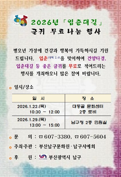 이번 행사는 부산남구문화원(원장 나용승)이 주최하고 남구문화예술회 서예회(회장 박태경)가 주관하며, 서예가들이 직접 참여해 전통의 멋과 정성을 담은 입춘방을 무료로 나눌 예정이다.